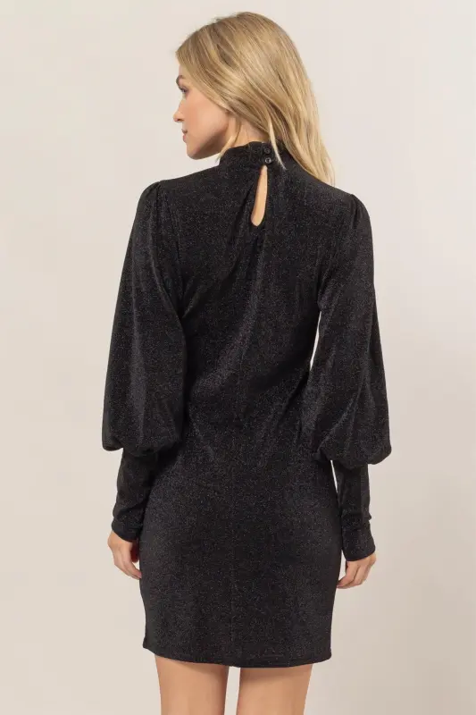 Experience a memorable night in this form-fitting dress! Made with glitter knit fabric, it shines in the light. The midi silhouette flatters, while the mock neck and bishop sleeves add elegance. With a back button closure and keyhole cutout, this dress is perfect for any special event. Whether it's a party or romantic dinner, it will surely make a statement!